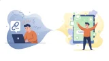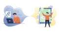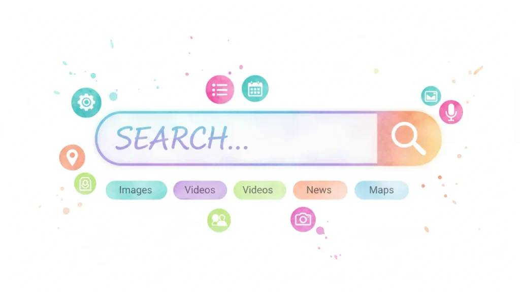検索窓とフィルターアイコンをモチーフにした、効率的な素材探しを表現したイラスト