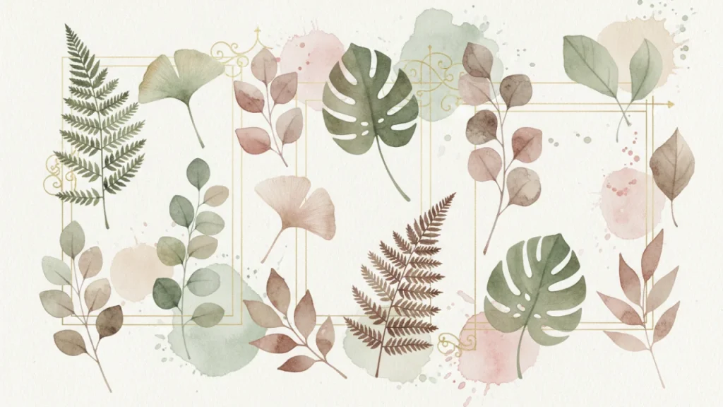 ボタニカルや水彩画風の、エレガントで洗練されたデザイン素材のコラージュ