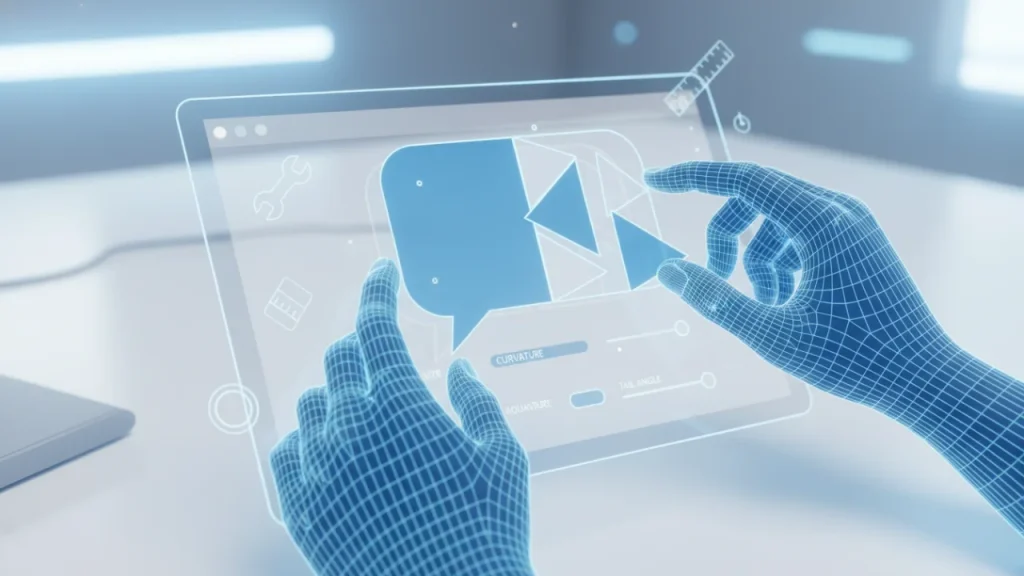Canvaの左側メニューの「素材」タブの中には、「線と図形」というカテゴリがあります。最近のアップデートにより、ここに入っている標準の「吹き出し」図形は非常に優秀になりました。配置した後に図形をクリックすると、周囲にあるハンドルを引っ張ることで縦横の比率を自由に変えられるだけでなく、しっぽ(吹き出し口)の先にある黄色い丸いポイントをドラッグすることで、しっぽの長さや向き、太さを自由自在にコントロールできるようになったんです。