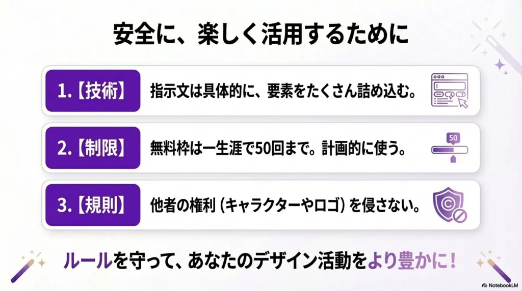 AIを使って手軽に画像を作れるのは素晴らしいことですが、ビジネスで利用する際や、生成する画像の内容についてはいくつか気をつけておきたいルールがあります。ここからは、商用利用や著作権など、安全に使うための重要な注意点について解説します。