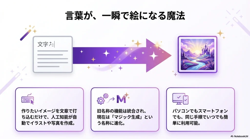 Canvaは近年、AIを活用した機能を「Magic Studio(マジックスタジオ)」というブランド名で統一して次々とリリースしています。文章を自動生成する「マジック作文」や、写真の不要な部分を消せる「マジック消しゴム」などと同じように、テキストから画像を生み出す機能も「マジック生成(英語名:Magic Media)」という名前に統一されました。