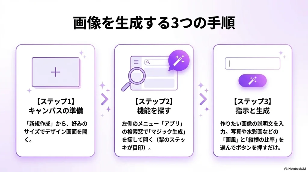 それでは、PCのブラウザ版Canvaを使った、基本的なマジック生成の操作手順をご紹介します。流れはとてもシンプルなので、ぜひ一緒に操作しながら確認してみてください。