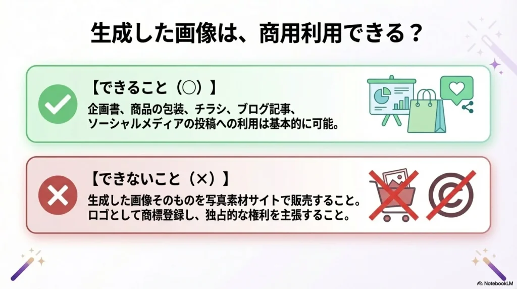 自社のプレゼン資料や商品のパッケージ、チラシのデザインなどに組み込んでビジネス目的で利用することは、基本的には問題ありません。ただし、AIによって生成された画像そのものを、そのままストックフォトサイトで販売したり、独占的な権利を主張して第三者の利用を制限したりすることはできません。